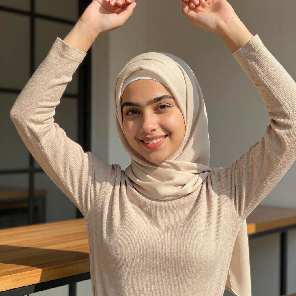 Photograph of a young woman with light brown skin and dark brown eyes, wearing a white hijab, orange top, floral cardigan, and green pants. She sits against a white brick wall, with yellow sunglasses on her head, looking to the side. The background includes a glass door and a poster on the wall.