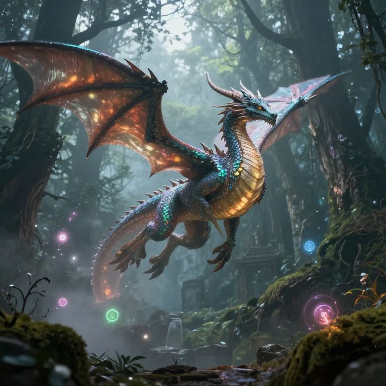 Digital artwork depicting a dark, cave-like setting with a large, menacing, dragon-like creature with blue and grey scales, glowing red eyes, and sharp claws, crouched in the center. The cave walls are textured with moss and fungi, illuminated by bioluminescent mushrooms in shades of blue and green. Small, glowing orange fungi are scattered on the ground. The creature's detailed scales and muscular build contrast with the eerie, glowing flora, creating a mystical, otherworldly atmosphere. The cave's entrance is framed by dark, jagged rocks.