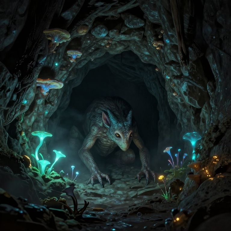 Grotter creature dwelling in a dark subterranean grotto, bioluminescent plants and fungi illuminating rough stone walls, misty atmosphere with shadows and eerie glow, detailed fantasy art style, moody and immersive.