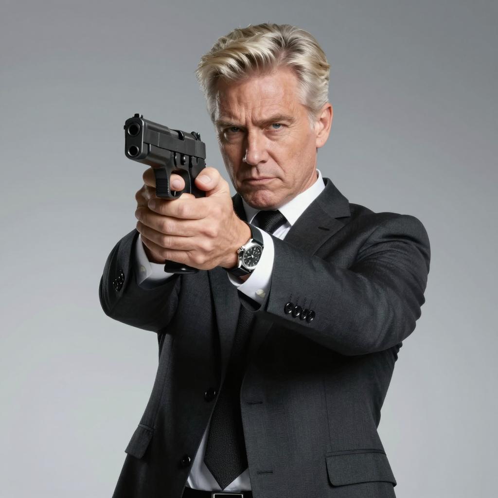A middle-aged man with short brown hair, wearing a black shirt with white stripes, pointing a black revolver directly at the camera. Bright yellow background. Man has a serious expression. Gun barrel in foreground. Man's right hand on trigger. Upper body visible. Textured background.