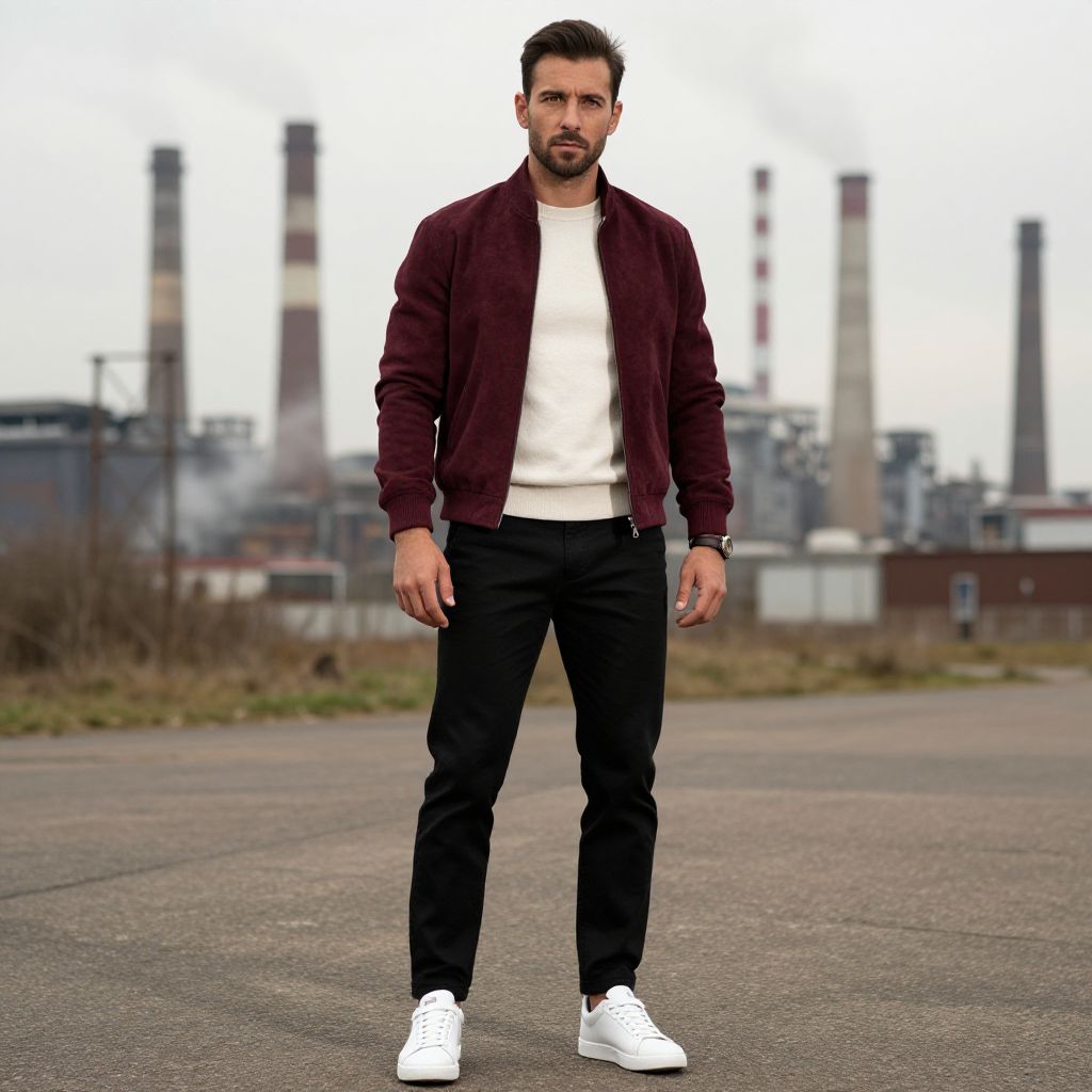 A man, burgundy suede bomber jacket, cream crew neck sweater, slim-fit black chinos, retro-inspired white trainers, leather wristband, industrial landscape, steam rising from stacks, cinematic film style, confident expression Man has masculine face and piercing eyes