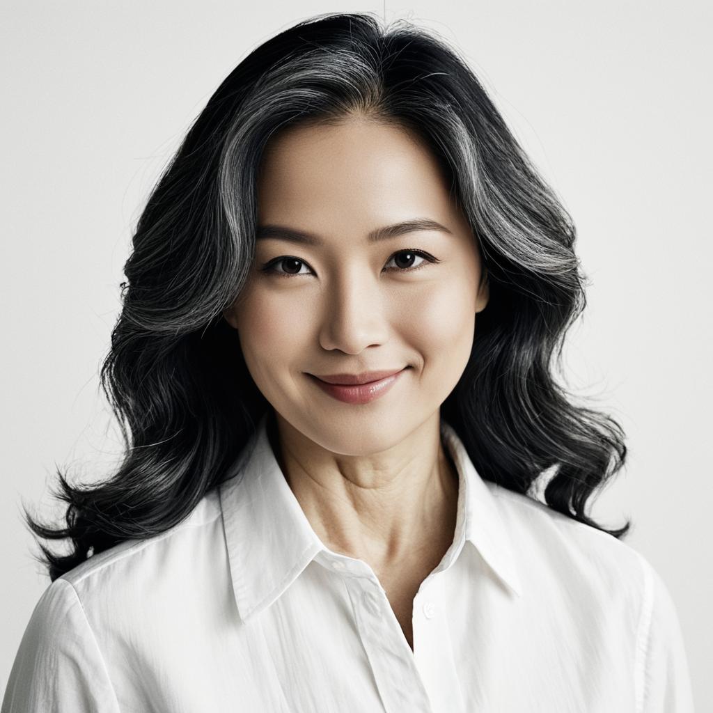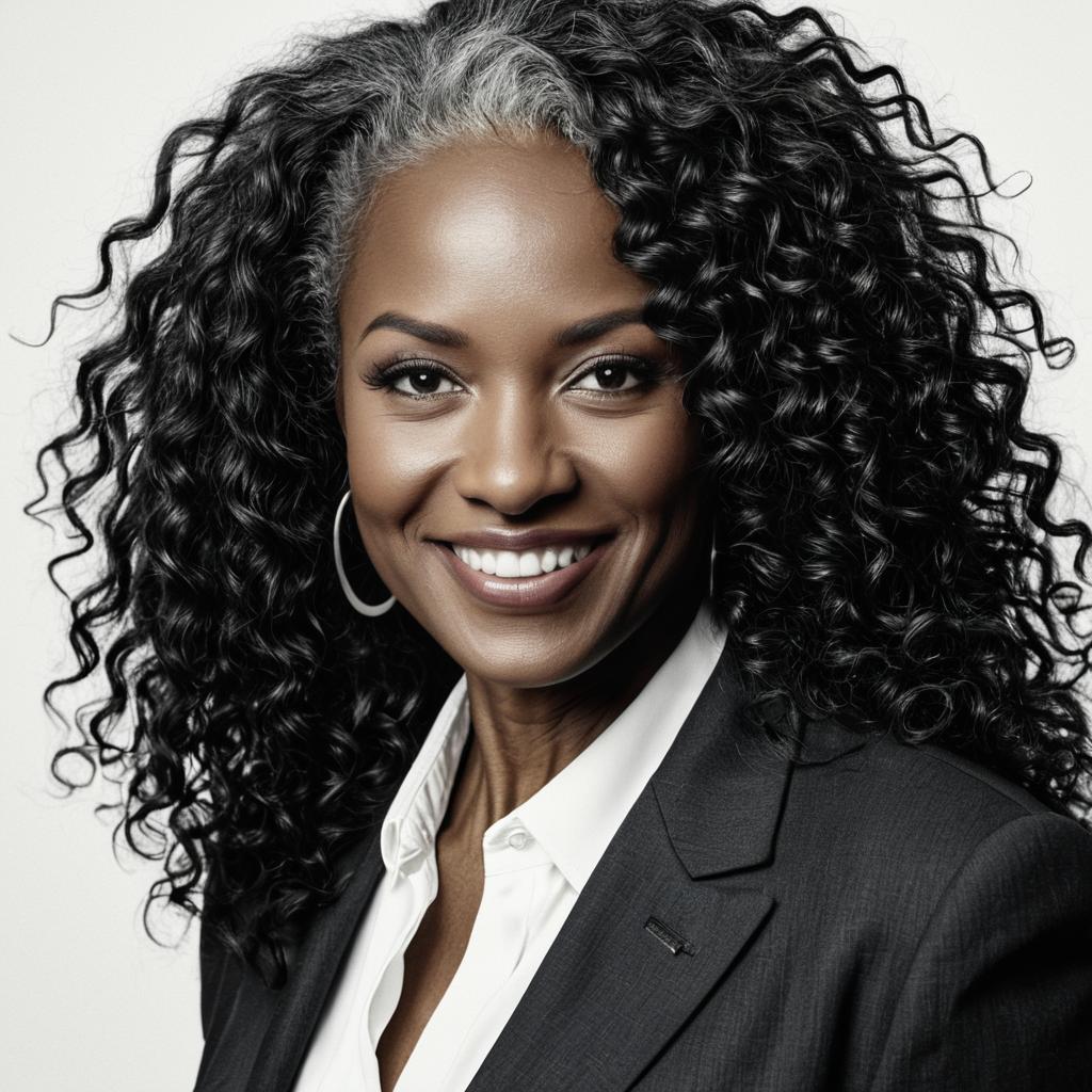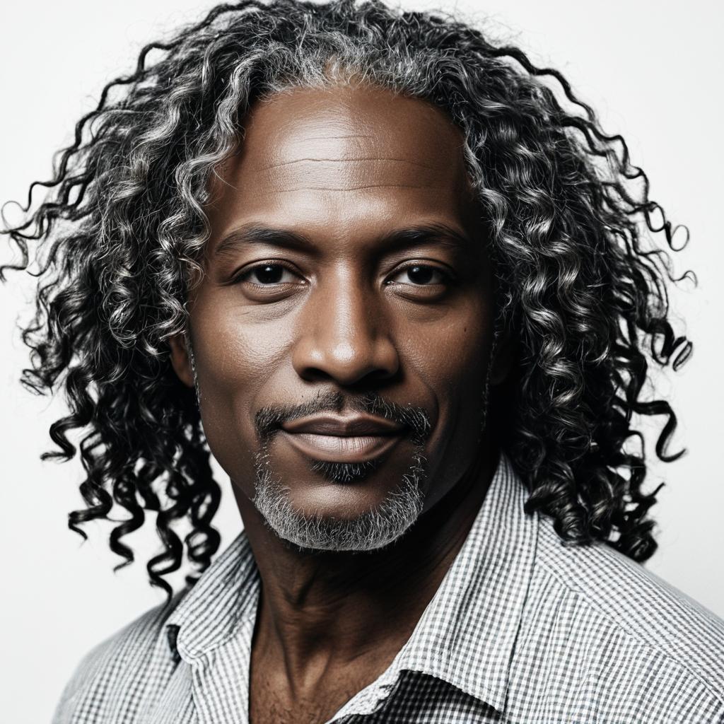 Charcoal Very realistic studio portrait of an attractive and beautiful middle-aged African man, long curly hair, appropriate casual shirt, white background, really white background, annie leibovitz photography style, serious face, straight nose, cat eyes, light smiling, straight face