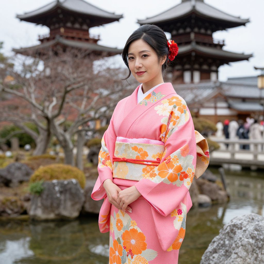 Elegant woman wearing a vibrant pink kimono adorned with orange floral patterns, complemented by a matching obi and hair accessory featuring a bold red flower, stands gracefully against the serene backdrop of Shosei-en Garden and Kennin-Ji Temple in Kyoto's Gion District.