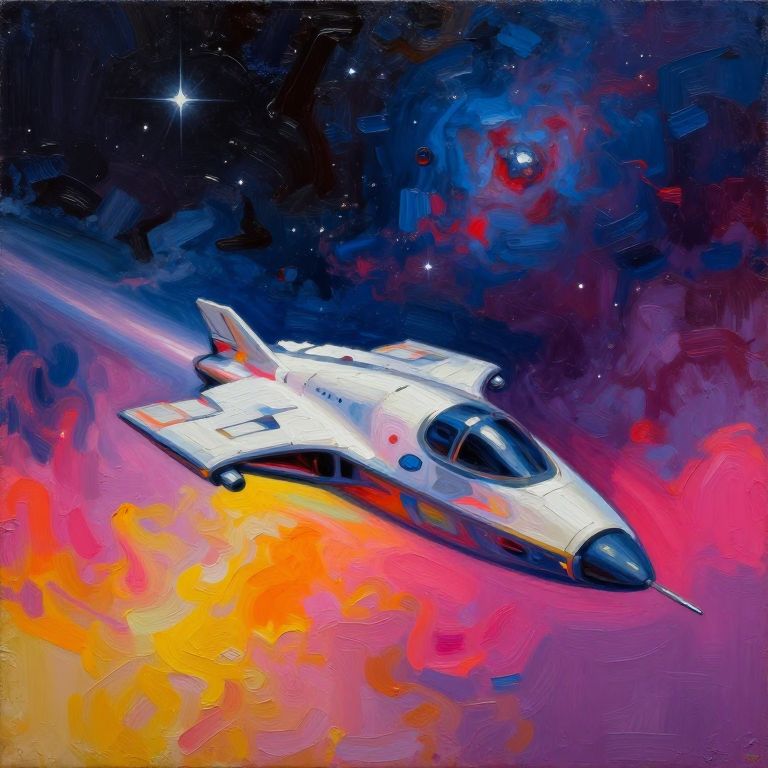 Aidmainkstyle, abstract oil painting, gradient vibrant neon colour, rough, textural, broad brush strokes, a sleek spaceship traversing interstellar space, detailed night sky with stars and nebulas