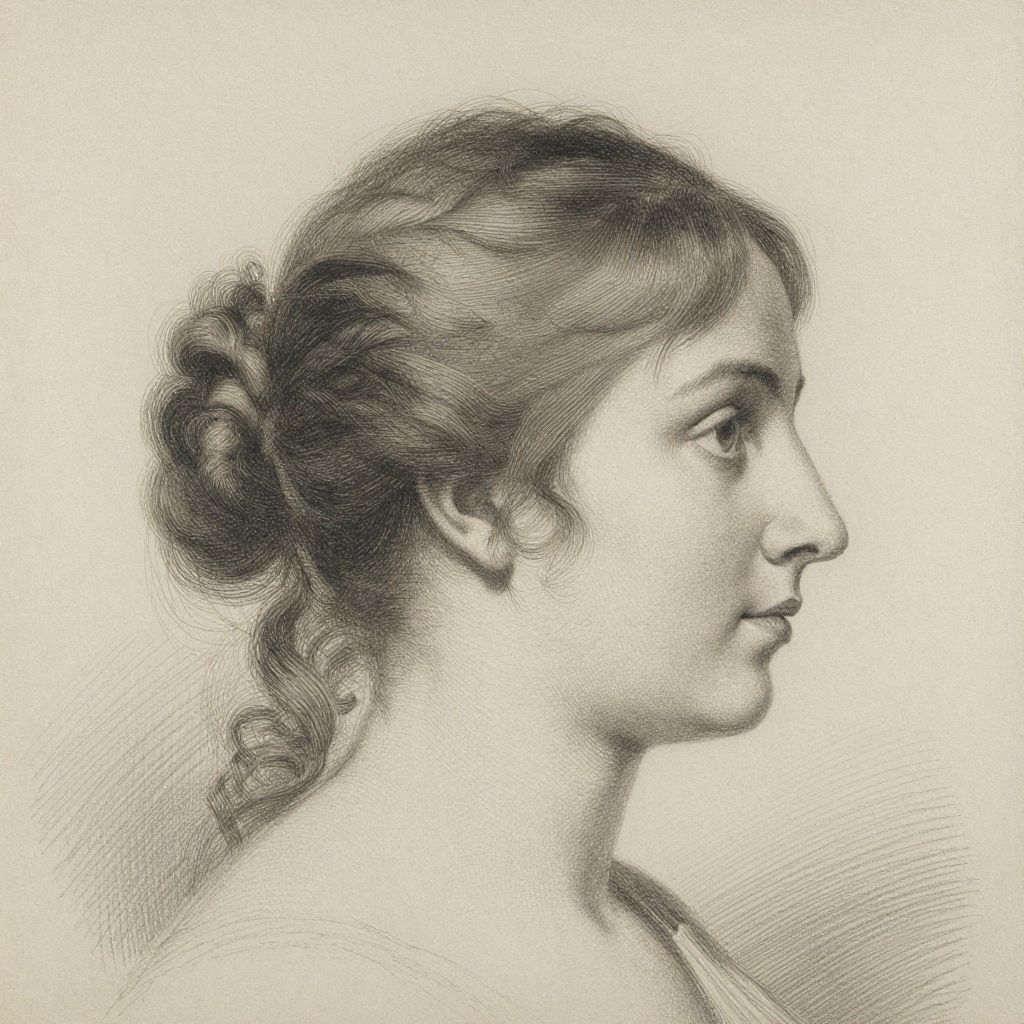 Black-and-white pencil drawing of a young woman in profile, showing delicate features, wavy hair in a bun, and soft shading.