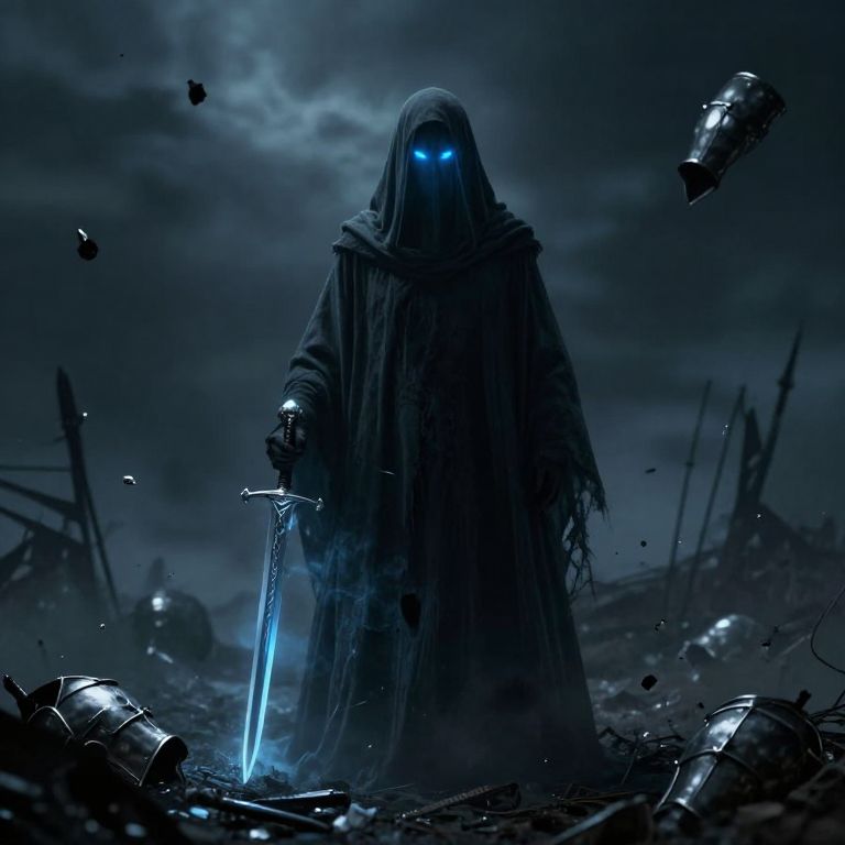Shrouded ghost standing at the edge of a desolate battlefield at night, cloaked in wispy shadows, eyes glowing with a cold blue fire, spectral sword floating beside it, surrounded by floating fragments of armor and weapons, evoking a sense of lost honor and haunting past