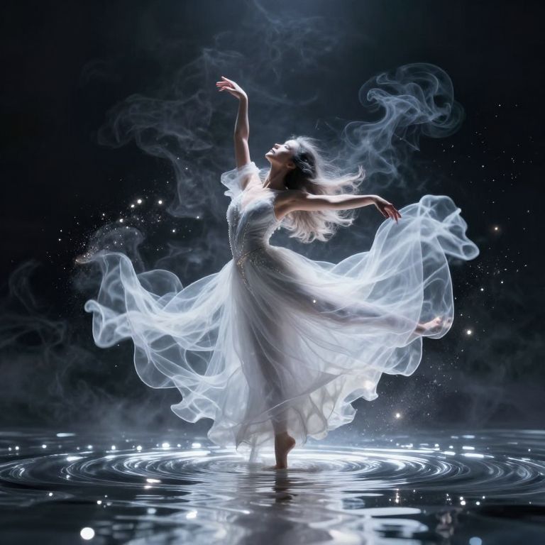 Ethereal grace transcends the boundaries of form and substance as a dancer, cloaked in swirling smoke and radiant light, pirouettes upon a shimmering expanse of liquid mercury, leaving behind a trail of celestial stardust that whispers of dreams and the infinite dance of existence.