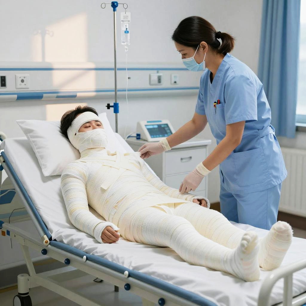 Full body cast hospital ward, patient in complete plaster cast and bandages, nurses providing care, sterile clinical design, intravenous drip stands, soft sunlight enters through blinds, detailed focus