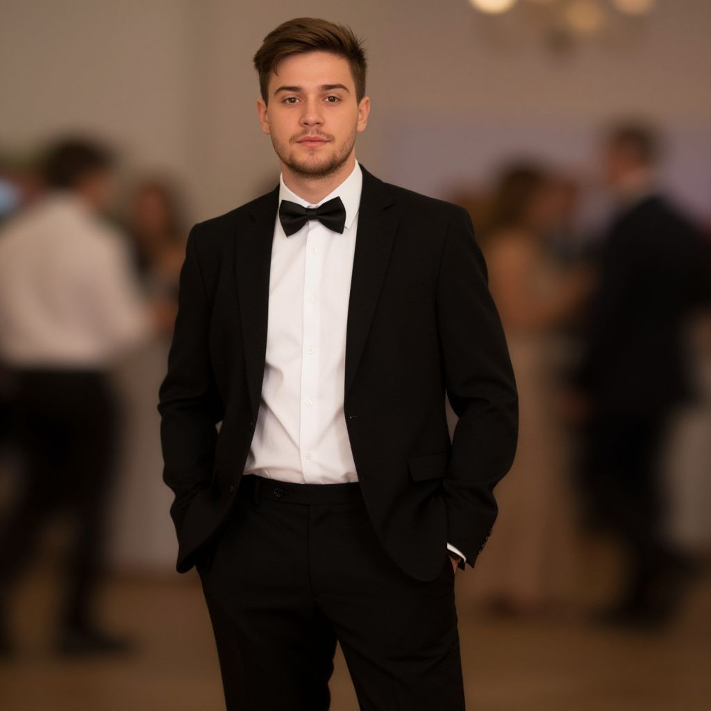 Male dress birthday party, 1boy, blurry background, pants, shirt, facial hair, blurry, black pants, brown hair, jacket, bowtie, male focus, looking at viewer, black jacket, bow, hands in pockets, short hair, solo focus, standing, realistic, white shirt