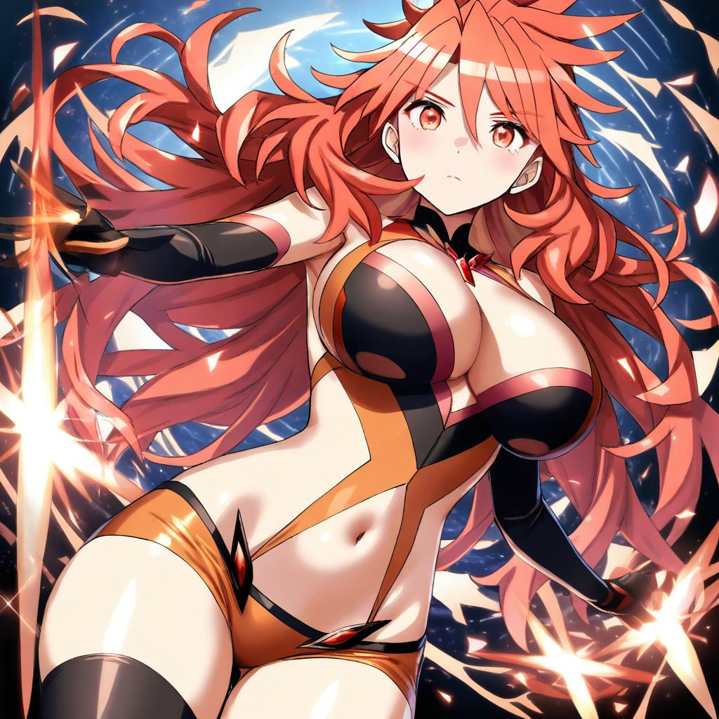 Amou kanade, senki zesshou symphogear, 1girl, red eyes, hair between eyes, orange eyes, red hair, long hair, large breasts, cleavage, navel, by artist tsukumiya amane, animagine