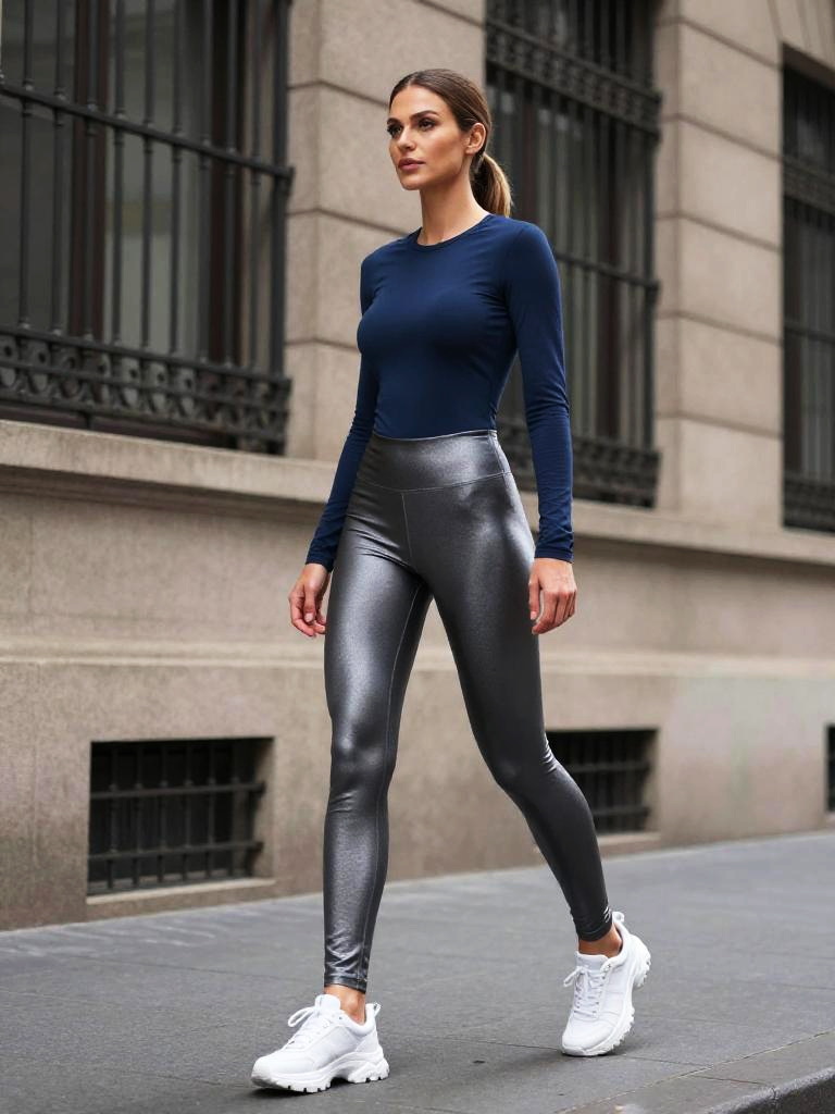 Woman wearing shiny leggings, slim woman with long straight blonde hair and bronzed skin in sporty streetwear, dressed in navy blue long-sleeve fitted top and reflective gunmetal silver leggings, retro-style athletic shoes on her feet, standing outdoors on a city sidewalk with camera positioned low behind her, one leg slightly forward and head turned in profile, tall historic buildings and ornate iron window grilles in the background, urban street-style photo, high resolution, natural daylight