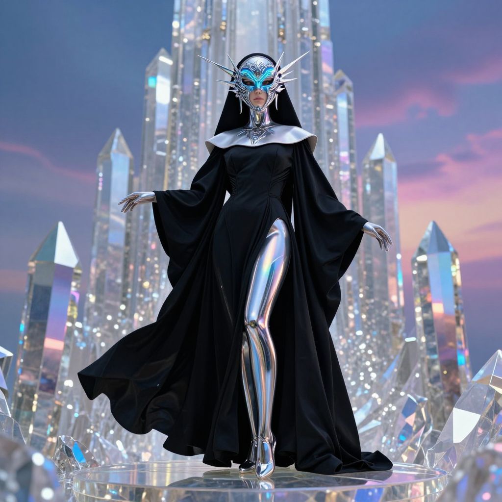 A hyper-realistic full-body portrait of a regal, seductive woman walking with a dynamic, commanding pose, radiating elegance and power, She wears a sharp, symmetrical chrome crown with blade-like points that reflect radiant metallic highlights, evoking a futuristic brilliance, Her flowing robe, crafted from glowing neon dots and vivid lines, shifts mesmerizingly between electric cyan, deep magenta, and radiant gold, creating a surreal, otherworldly allure, Her silver and azure hair, softly glowing, floats weightlessly, amplifying her ethereal presence, while her robe flows in gravity-defying waves, accentuating the motion, Beneath her, the ground features a black obsidian tile floor, its uneven hexagonal tiles streaked with veins of molten gold light that pulse like living energy, adding depth and surreal vibrance, Two veiled women in matte-black robes stand solemnly in the background, their faces obscured and their mysterious presence deepening the enigma, The backdrop is a neon turquoise gradient, faintly illuminated by glowing, cryptic Illuminati-inspired symbols, their soft pulses harmonizing with the glowing tiles, Cinematic lighting bathes the scene in an ethereal glow, accentuating the crown’s brilliance, the robe’s vivid tones, and the surreal floor, Captured in 8K resolution with a 35mm lens at f/1, 2, every detail is rendered with precision, merging hyper-realism and surreal elegance into a stunning visual narrative