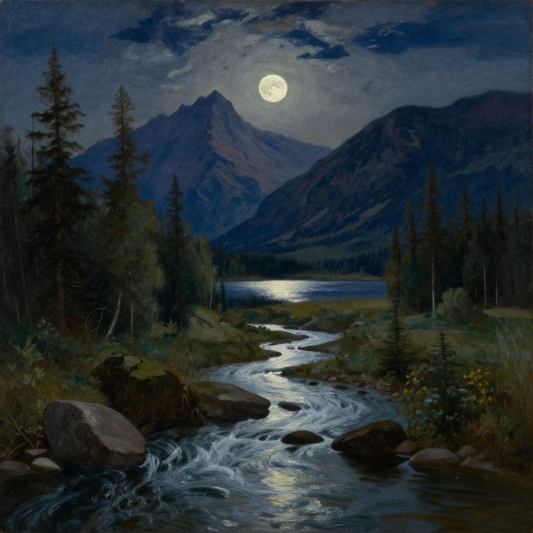 This digital painting depicts a serene nighttime landscape. A moonlit mountain range dominates the background, with the full moon casting a bright, silver glow over the scene. Dark, towering pine trees frame the sides of a winding, rocky stream, which flows through the center of the image, reflecting the moonlight. The stream's gentle ripples create a sense of movement. The foreground features large, smooth rocks and lush, green grass. The sky is a deep blue, transitioning to darker shades near the horizon. The overall mood is peaceful and mystical, with a realistic yet slightly stylized artistic approach.