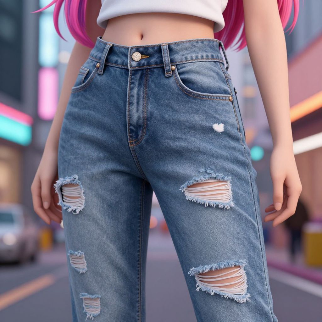 Anime girl jeans close-up, stylish young woman with vibrant hair, wearing trendy ripped jeans and a casual top, urban street background, soft lighting, detailed fabric textures, dynamic pose, colorful cityscape in the evening, high detail, anime style