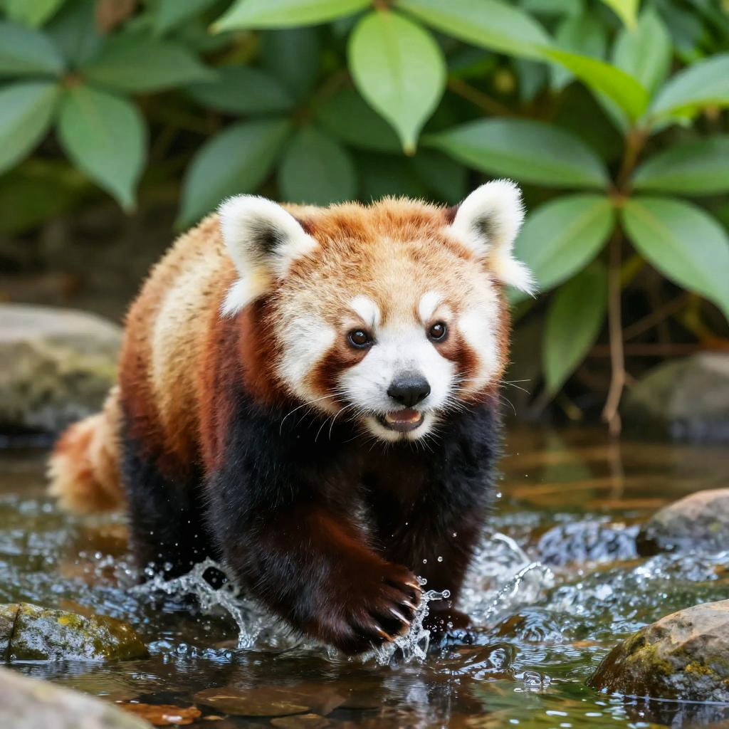 Baby brown panda playing beside a sparkling stream, vibrant green foliage around, playful and adorable expression, morning light