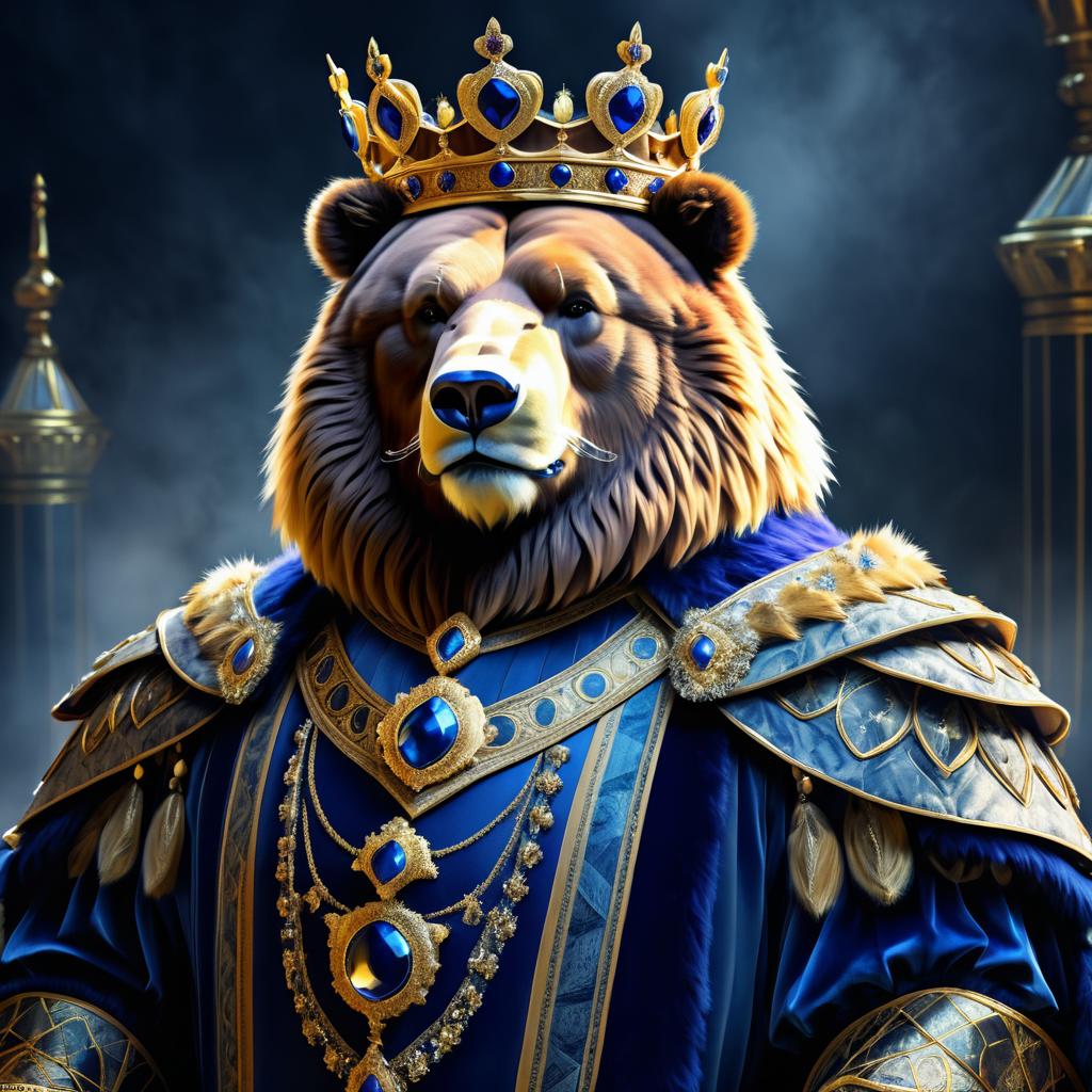 Highly detailed digital painting of a stern-looking bear dressed as a king, wearing an ornate gold crown adorned with blue gems and luxurious blue and gold royal robes. The bear sits majestically on a golden throne with a red velvet cushion, set against a background of classical columns and draped curtains, creating an elegant and regal atmosphere.