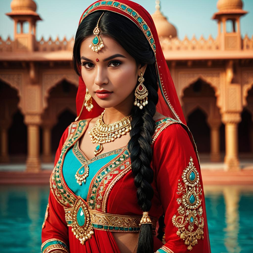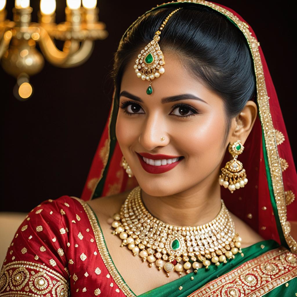 Indo western dress, photorealistic, Indian woman, traditional attire, red and gold dupatta, red choli, gold embroidery, gold necklace, earrings, forehead ornament, dark hair in updo, soft smile, standing in ornate, archway background, warm lighting, elegant, cultural, Indian wedding attire, detailed ures, jewelry, traditional dress, Indian architecture, realistic, clear focus, detailed costume design, beautiful, elegant woman, cultural heritage, traditional clothing, SD/T2I, photorealism