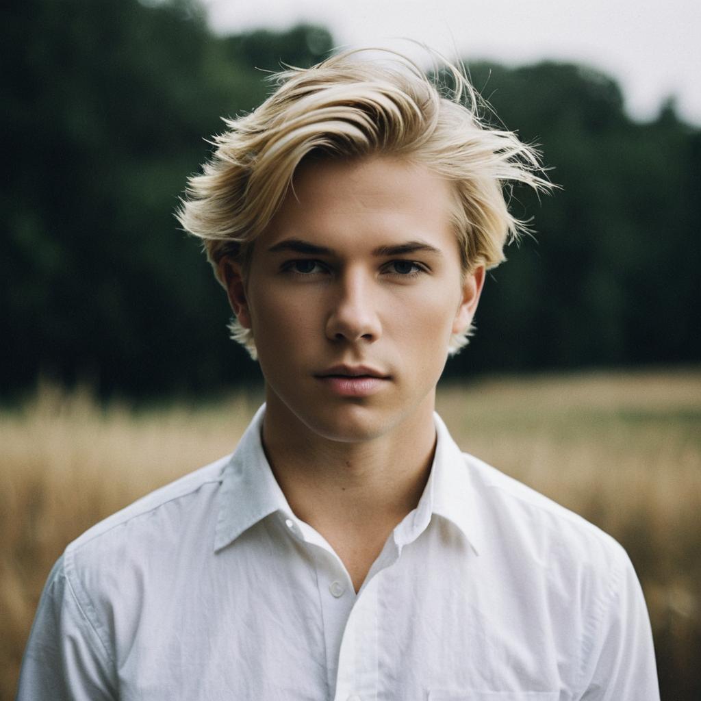 Portrait of a young blonde man with short hair wearing a white collared shirt, standing outdoors with a blurred natural background. The man has a neutral expression, looking directly at the camera. The photo focuses on his upper body and face with sleeves rolled up slightly.
