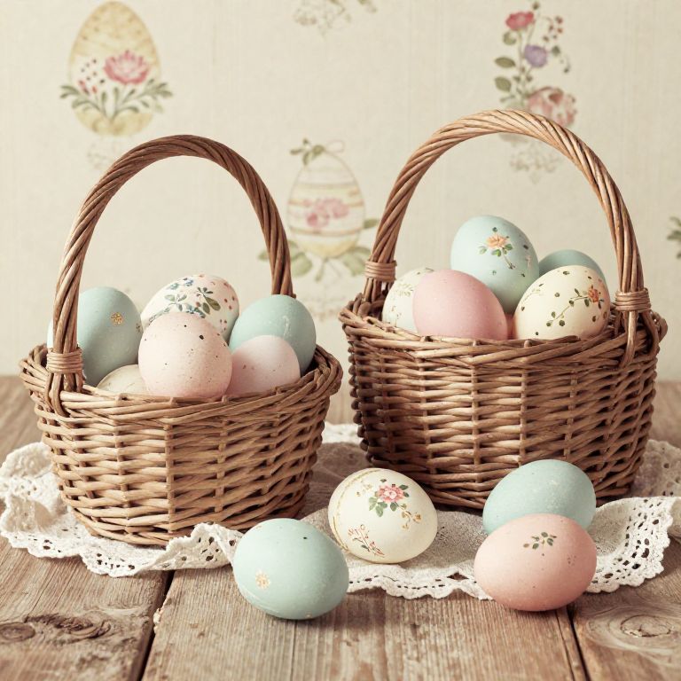 Photograph of two wicker baskets filled with pastel-colored, floral-patterned Easter eggs, placed on a wooden table with a white lace doily. The baskets are slightly different in size and both have curved handles. The eggs are in shades of pink, blue, and white, with delicate floral designs. Two eggs are also placed on the table in front of the baskets. The background features a softly blurred floral wallpaper, adding a vintage, springtime feel to the scene. The overall color palette is soft and pastel, creating a cozy, festive atmosphere.