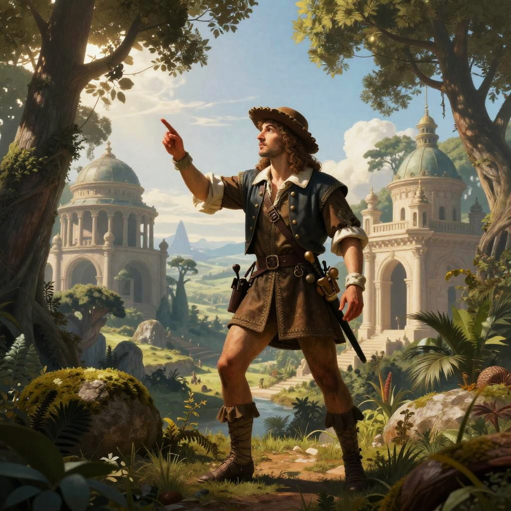 Raphael Ambrosius Costeau depicted as an explorer in a fantastical landscape combining Renaissance architecture and wild nature, digital art with hyper-realistic details, soft glowing light filtering through tall trees, blended historical and imaginative visual elements conveying curiosity and discovery.