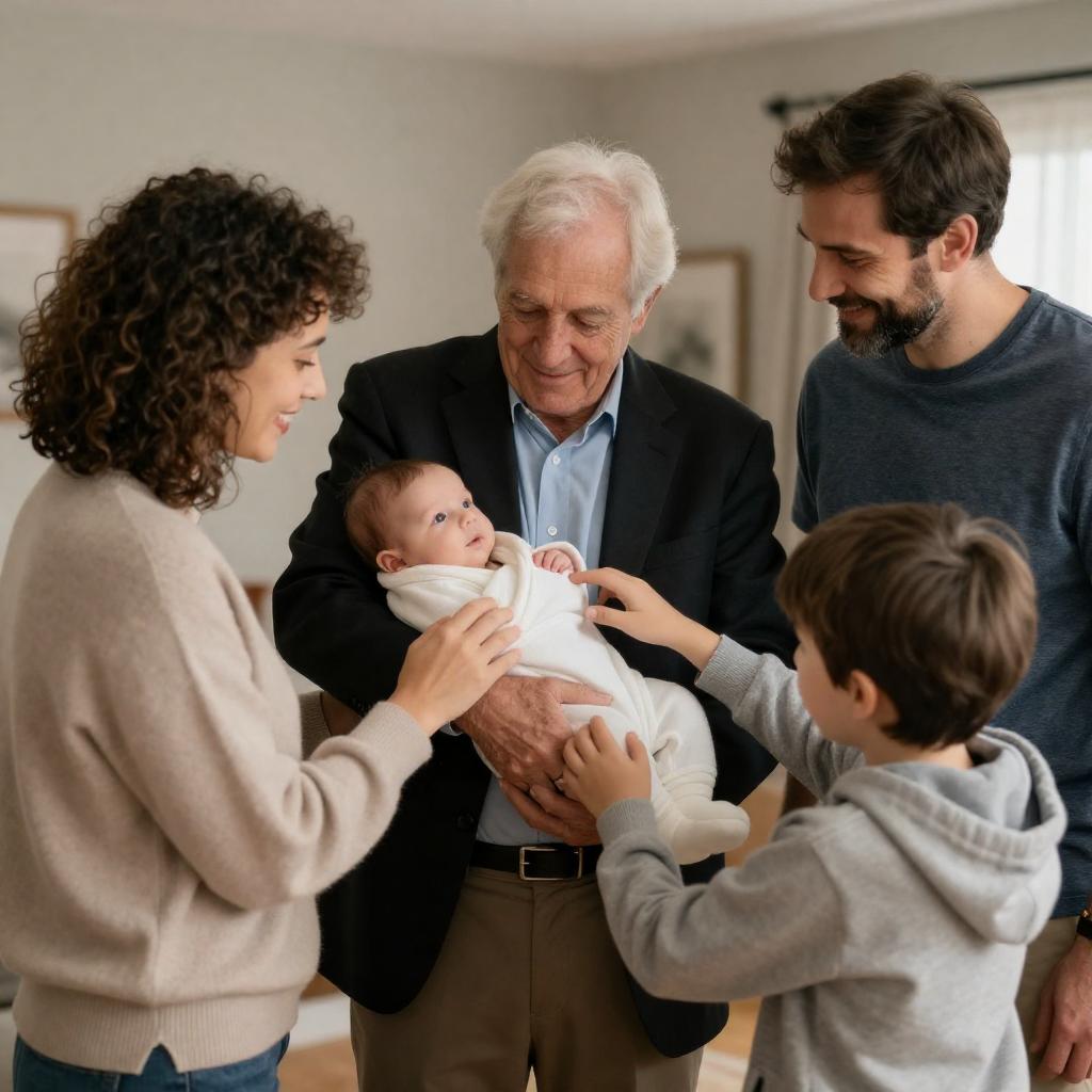 Photograph of a warm family gathering. An elderly man with white hair in a black suit holds a swaddled baby, surrounded by family members. A woman with curly hair in a beige sweater, a bearded man in a blue shirt, and a young boy in a gray hoodie reach out to touch the baby. Warm indoor lighting.
