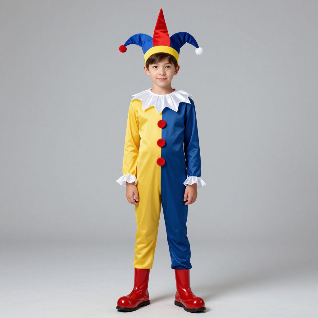 Photograph of a young boy standing against a plain gray background. He is dressed in a colorful jester costume: a long-sleeved onesie with one side yellow and the other blue, white collar, and red buttons. He wears a red and blue jester hat with white pom-poms, and red boots. The boy has short brown hair and a neutral expression. The costume is shiny and the colors are vivid, contrasting with the simple background. The lighting is even, highlighting the costume's bright colors and the boy's fair skin.