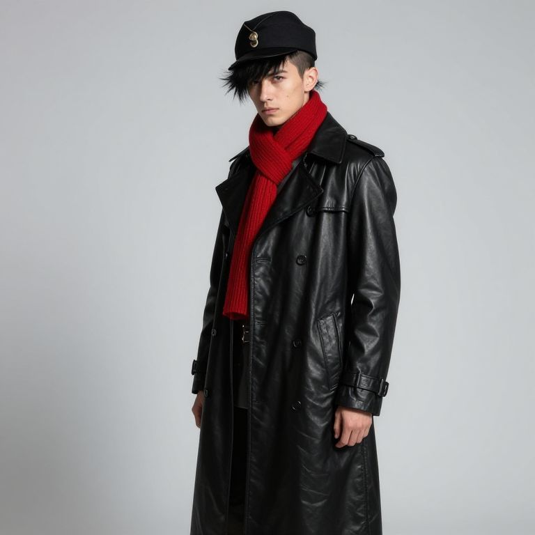 Photograph of a young Asian man with pale skin and black, slightly messy hair, wearing a black leather trench coat with large lapels, a bright red knit scarf, and a black military-style cap with a small emblem. He stands against a plain, light gray background, looking slightly to the left with a neutral expression. His coat is long, reaching mid-thigh, and the texture of the leather is smooth and slightly shiny. The overall style is modern, edgy, and minimalist, with a strong contrast between the dark coat and bright scarf.