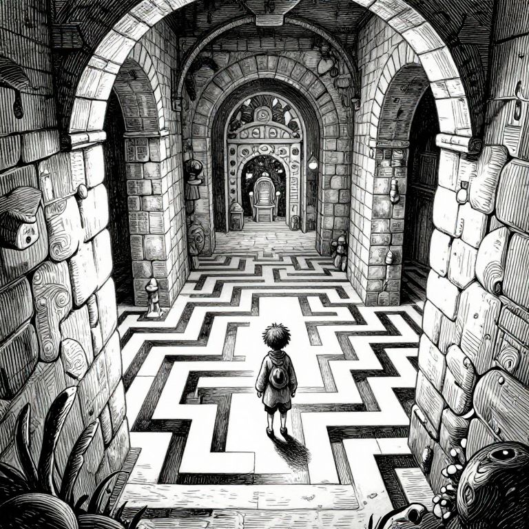 Imagine an enchanting scene reminiscent of Edward Gorey's pen-and-ink illustrations blended with Dr. Seuss' whimsical storytelling. Picture a young adventurer from a bug's-eye perspective navigating through an intricate hand-drawn labyrinth, their small figure juxtaposed against towering stone walls. This captivating illustration evokes both wonder and apprehension as dimly lit passages lead to mysterious chambers filled with unexpected marvels and riddles. The detailed drawing encapsulates the spirit of exploration and curiosity while inviting viewers into a remarkable journey within the realm of imagination.