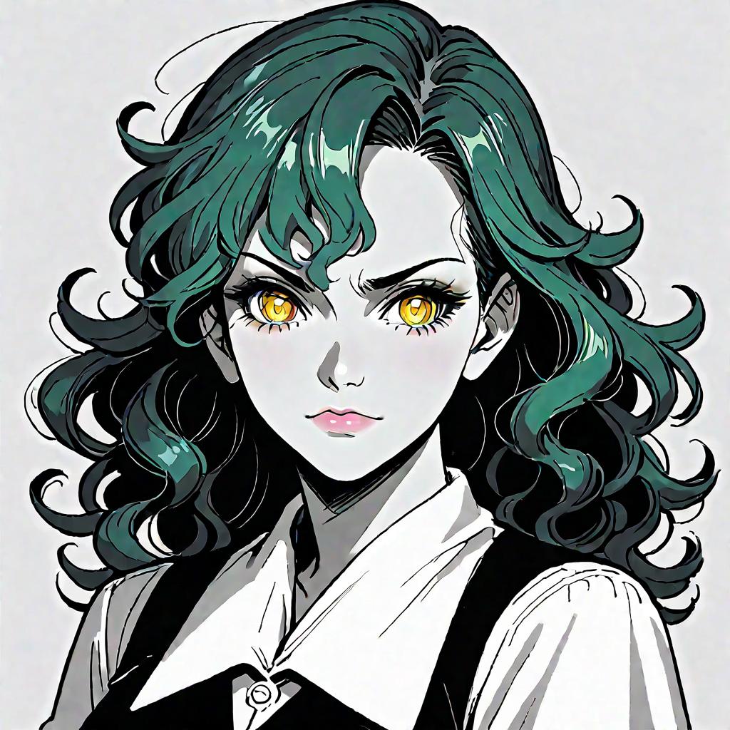 Score_9, score_8_up, score_7_up, source_anime (1girl), mature, green hair, bangs, messy wavy hair, yellow ringed eyes, formal shirt, melancholy, close up, portrait, closed mouth, glitching, Pencil drawing, Black and White, B&W, Low detail, sketch, concept art, Manga style, Anime style, line art, webtoon, manhua, chalk, hand drawn, defined lines, simple shades, simplistic, manga page, minimalistic