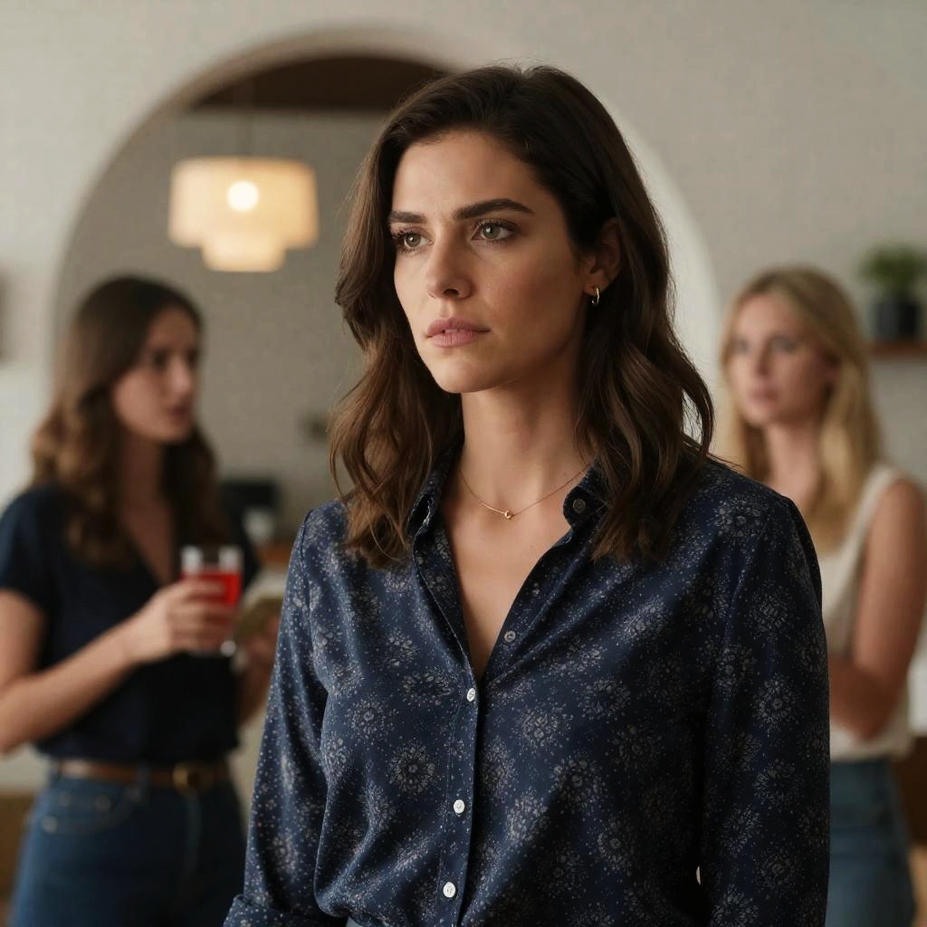 Photograph of a woman with shoulder-length brown hair, wearing a navy blue patterned blouse, looking to the side with a serious expression. Two women in the background, one holding a red drink, one with blonde hair. Indoor setting with archway, chandelier, and modern decor.