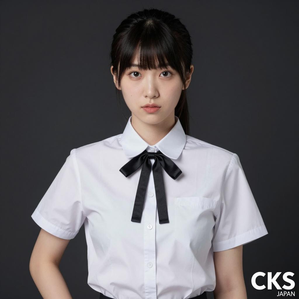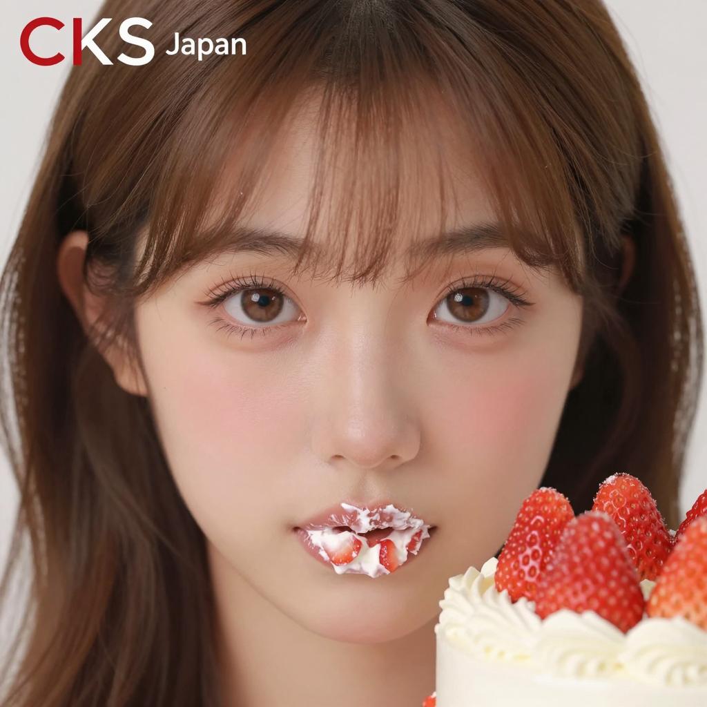 Close-up photograph of a young Asian woman with light skin, brown eyes, and light brown hair with bangs. She has her lips slightly parted, coated in white frosting with strawberry pieces. The right side of a partially visible cake with strawberries is in the foreground. She gazes directly at the camera. CKS Japan in the top left corner.