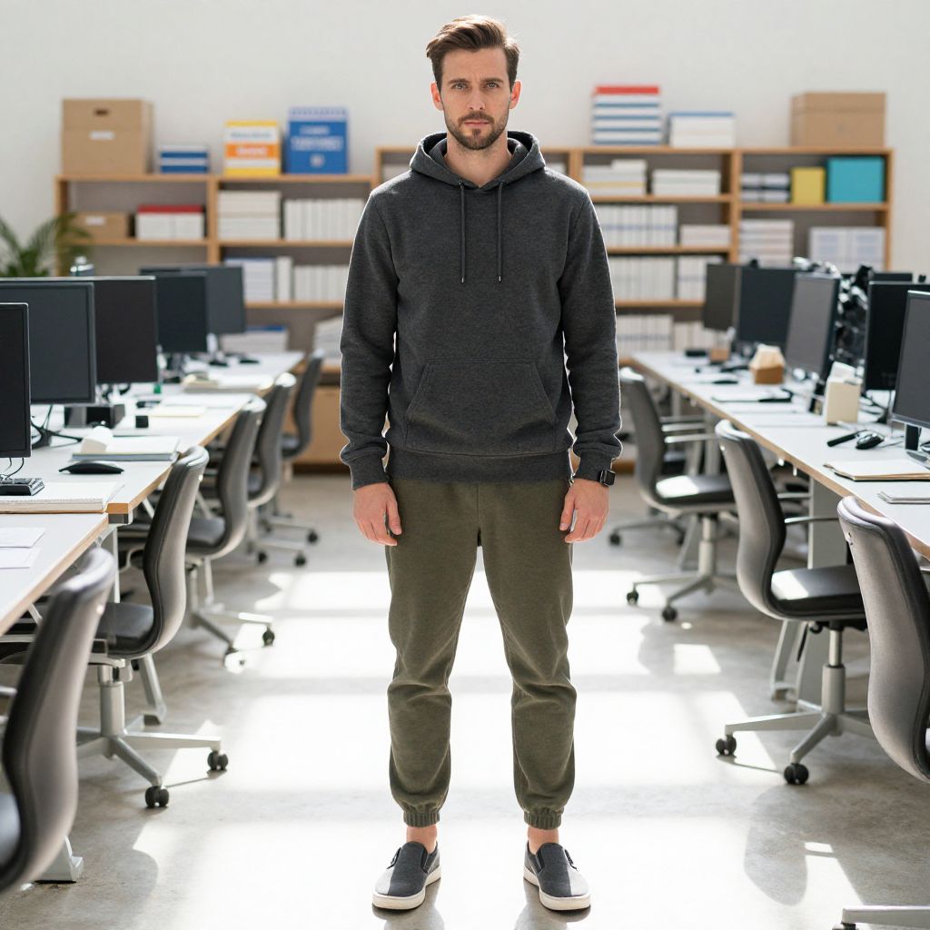 Photograph of a young Caucasian man with short brown hair and a trimmed beard standing in the center of a brightly lit office. He wears a dark gray hooded sweatshirt, olive green joggers, and black sneakers with white soles. The office has multiple desks with monitors, black office chairs, and storage shelves with colorful binders in the background. The floor is polished concrete, and the overall scene is well-organized and modern. The man stands with a neutral expression, his hands relaxed by his sides, and the lighting highlights him against the background.