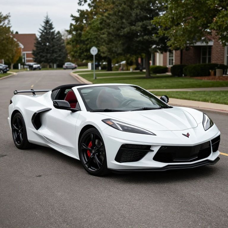Photograph of a sleek, white Chevrolet Corvette convertible with black accents and red brake calipers, parked on an empty suburban street. The car has a low, aerodynamic design with sharp, angular headlights and a black front grille. Black alloy wheels and a black soft-top roof are visible. The background includes green lawns, trees, and brick houses with a cloudy sky overhead. The street is paved and has a slight curve, with a sidewalk on the right side. The car's interior is partially visible, showing red leather seats.