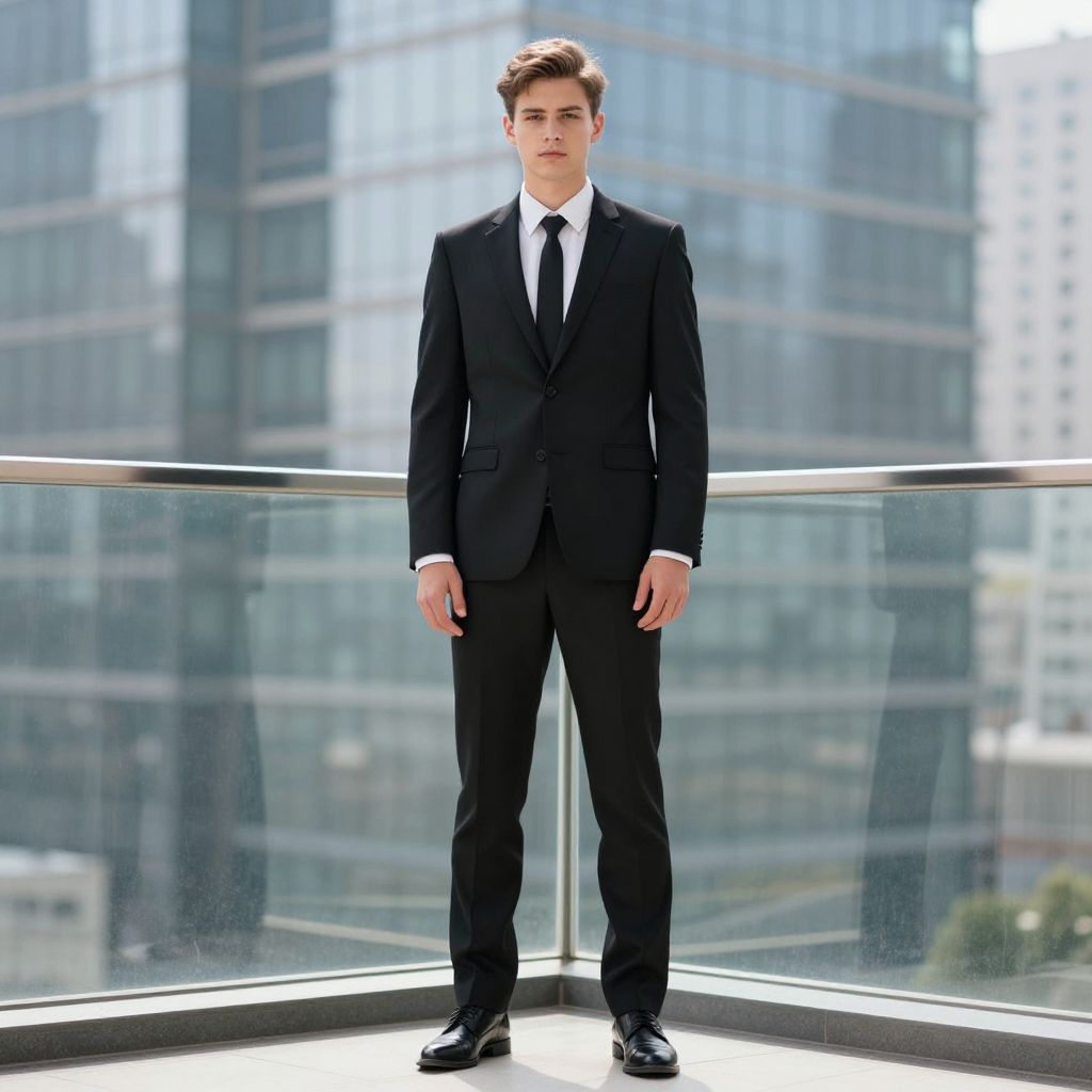 Photograph of a young, handsome white man with short brown hair, standing confidently on a modern glass balcony. He's wearing a sharp black suit, white shirt, and black tie. His black shoes are polished. The background shows blurred, tall, glass buildings, giving a cityscape vibe. The light is bright, highlighting his serious expression and formal attire.