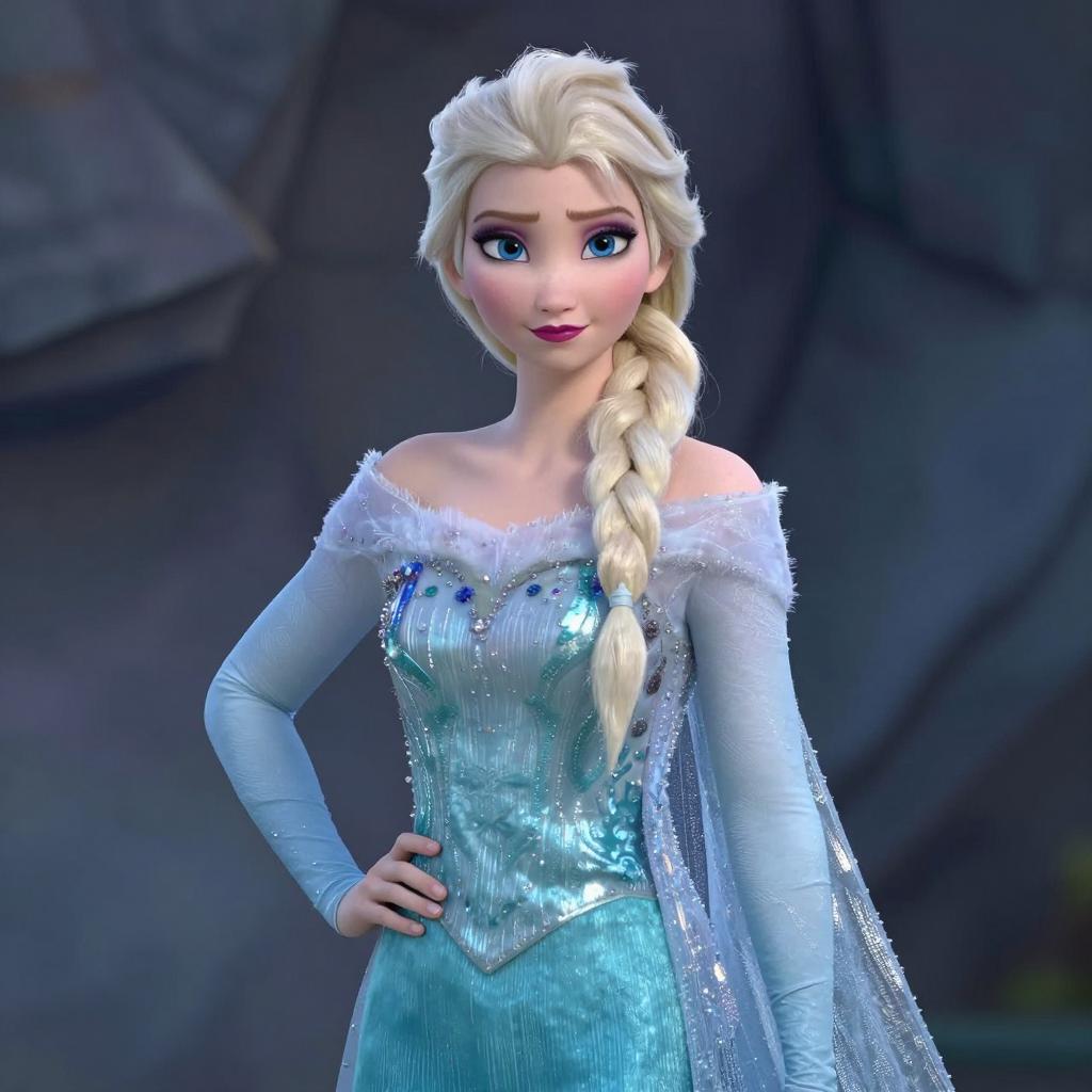 Photorealistic digital rendering of a woman in an Elsa-inspired costume featuring an off-shoulder light blue satin dress with intricate patterns and a translucent sheer cape. She has long blonde braided hair, fair skin, blue eyes, and a serious expression, standing confidently with one hand on her hip against a rocky background. High-quality details and soft lighting emphasize the regal and fantasy character style.