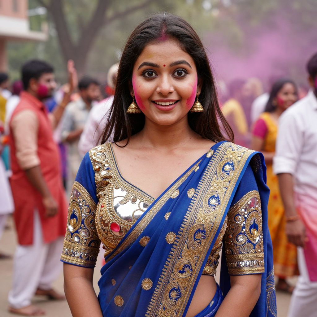 A traditional yet contemporary party saree blouse with mirror work and intricate peacock motifs in gold and blue, worn by a radiant young woman with soft brown skin, round cheeks, and wide, joyful eyes, in a traditional Holi celebration with dancing people in bright clothes and splash of colored powder in the air.. The woman has big tits and cute face