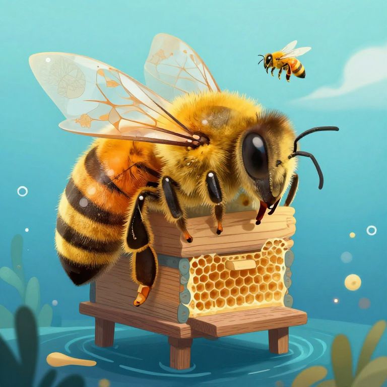 A giant bee’s hive rises from the ocean floor, its honeycombs storing moments of joy from every era.