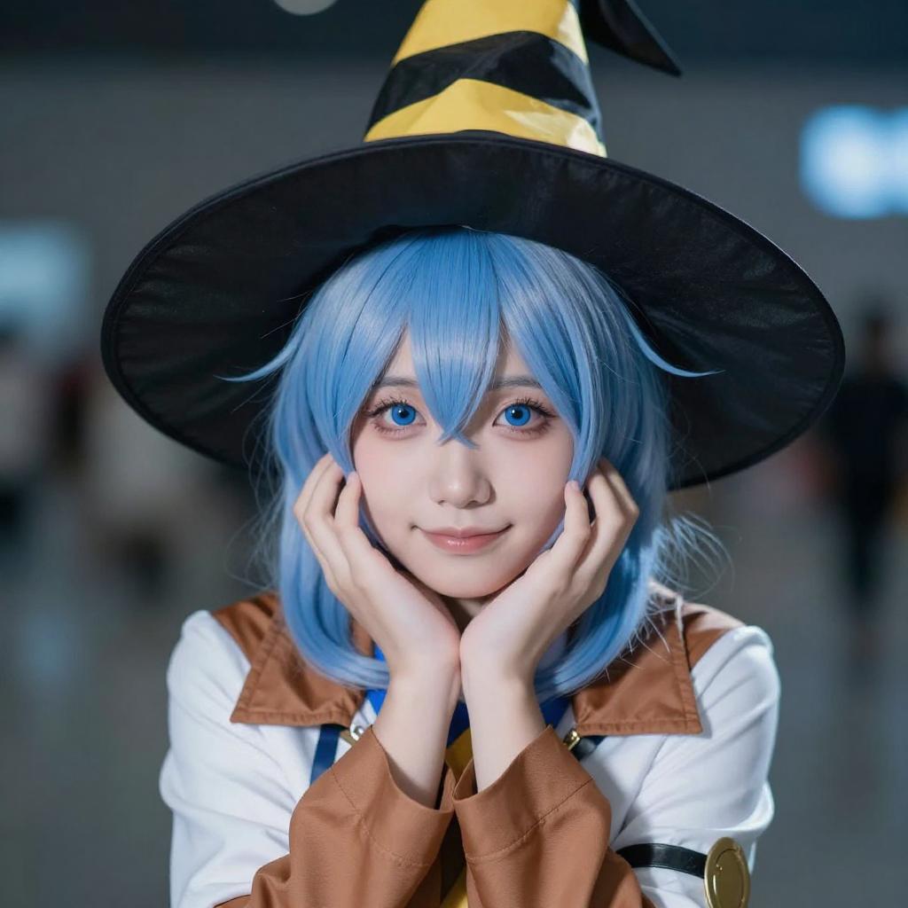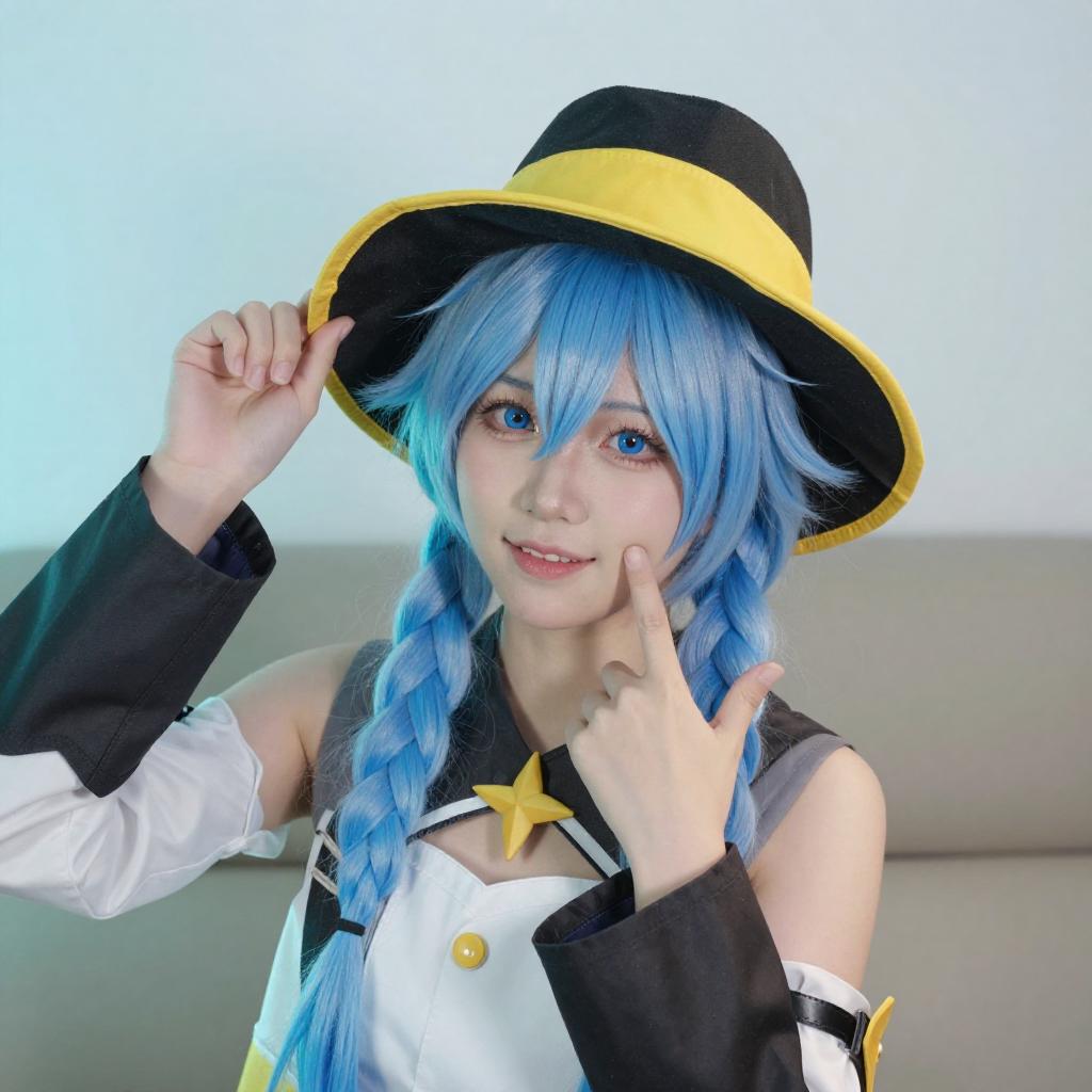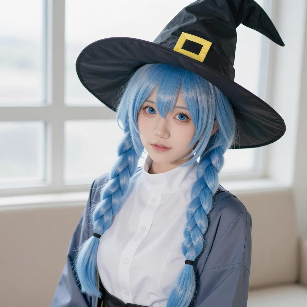 Photograph of a person with light blue hair and blue eyes, wearing a black witch hat with yellow accents, a beige jacket with white and black trim, and a gray shirt. They are holding the brim of their hat with their right hand, looking directly at the camera with a slight smile. The background is a gradient of blue and white.