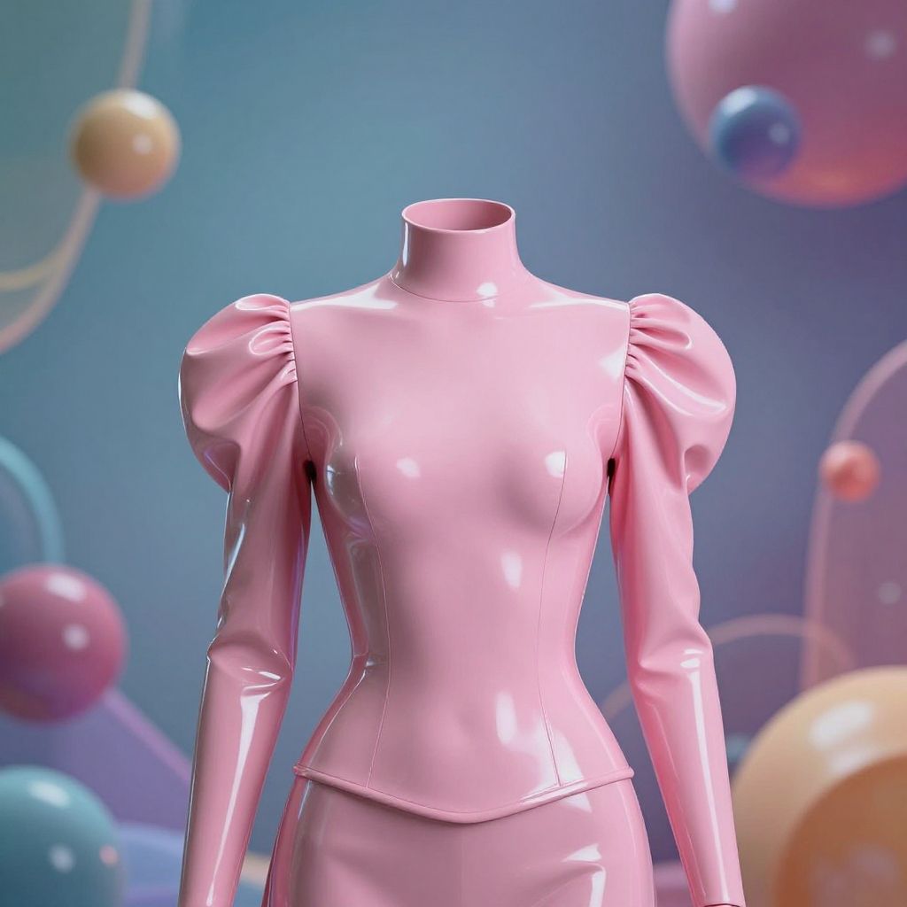 Photorealistic digital CGI image of a mannequin displaying a shiny, pink, zip-up, long-sleeve jumpsuit with puffed sleeves. The jumpsuit has a high collar and a central zipper extending from the neck to the waist. The mannequin has a black, cylindrical head. The background features a whimsical, colorful, and slightly blurred setting with multicolored, spherical decorations floating in mid-air. The light source is bright, creating reflections on the jumpsuit's glossy surface. The scene has a dreamy, almost surreal atmosphere with pastel and neon hues.