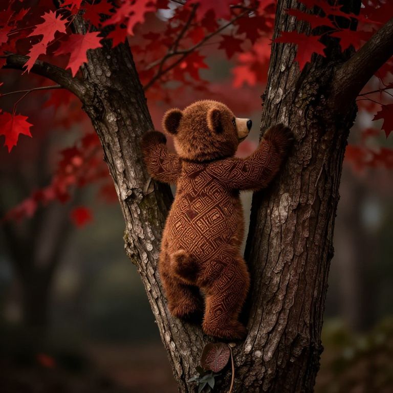 Photograph of a brown, plush teddy bear with a textured, woven pattern, climbing a tree with rough, dark bark. The teddy bear's arms and legs grasp the tree trunk, facing away from the camera. Vibrant red leaves surround the top of the tree, contrasting with the dark, blurred forest background. The teddy bear's small, round ears and black button eyes are visible, adding a cute, whimsical touch. The lighting highlights the texture of the teddy bear's fur and the tree bark, creating a warm, autumnal atmosphere.