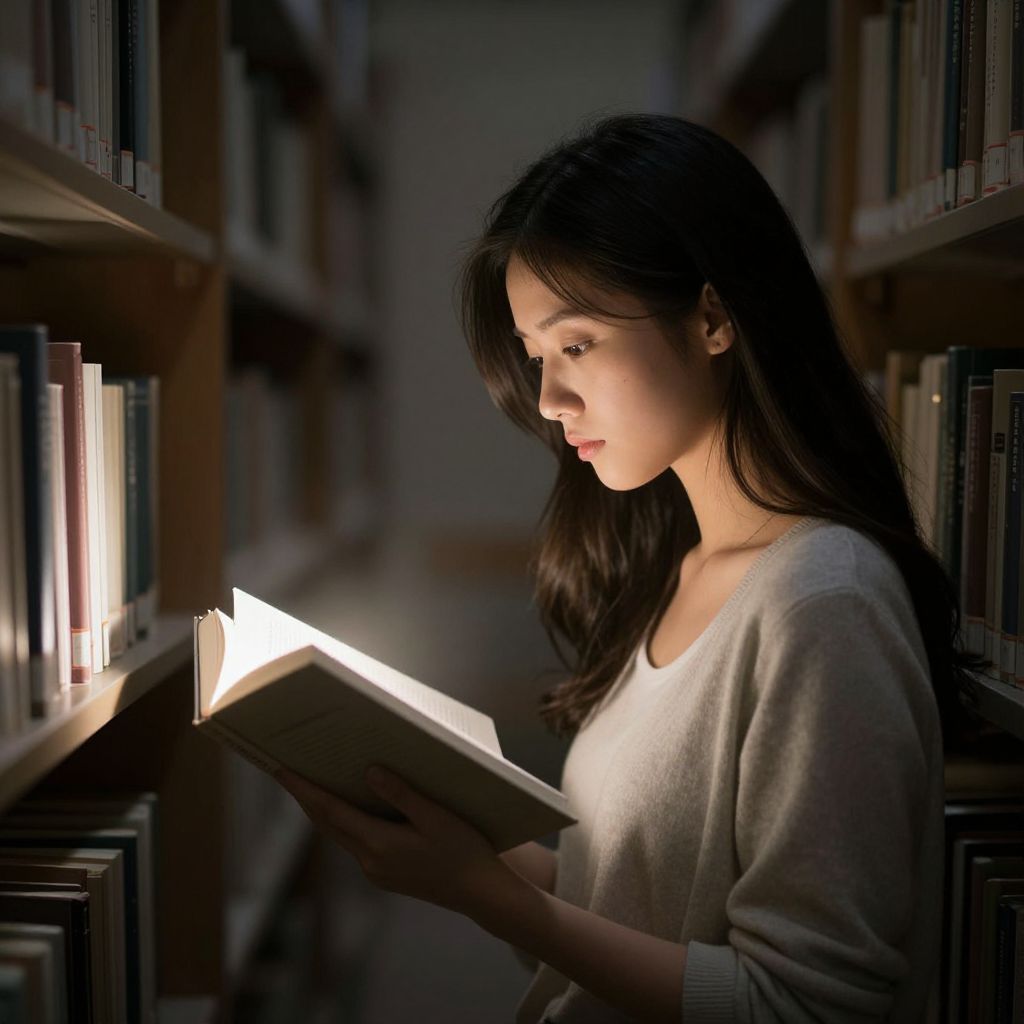 Photograph of a young Asian woman with long black hair, wearing a white sweater, reading a book in a dimly lit library, illuminated by a