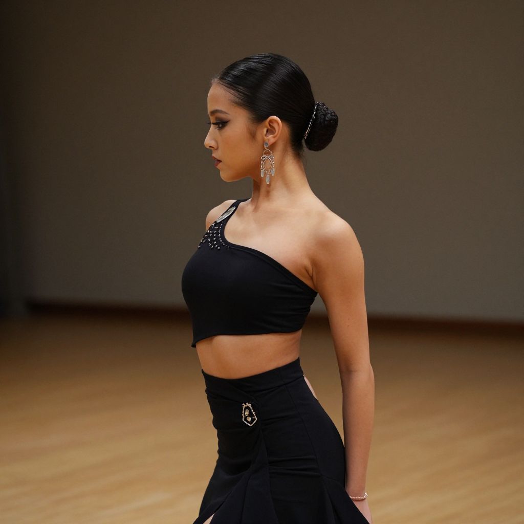 Asymmetrical dance costume, 1girl, solo, earrings, jewelry, realistic, dress, hair ornament, bare shoulders, single hair bun