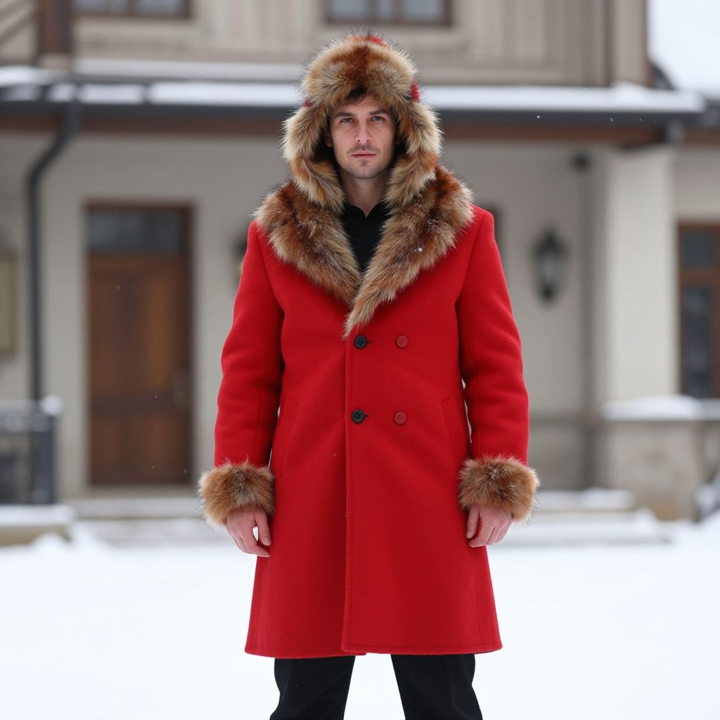 Photograph of a young man standing outdoors in winter. He has light skin, dark hair, and a serious expression. He wears a bright red, long woolen coat with fur trim on the collar, cuffs, and hood. The coat is double-breasted with black buttons. The fur trim is brown and looks thick and fluffy. He is also wearing black pants. The background shows a blurred, snow-covered building with beige walls and wooden windows. The man is centered in the frame, and the bright white snow contrasts with the dark building and his red coat.