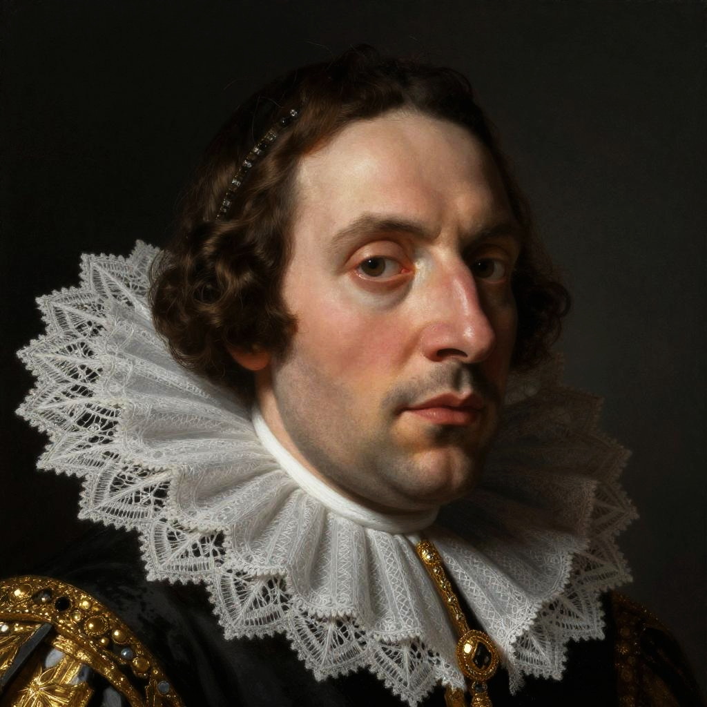 Aristocrat nose, majestic renaissance portrait featuring a regal figure with a pronounced nose, intricate lace collar, golden light, realism with dramatic chiaroscuro