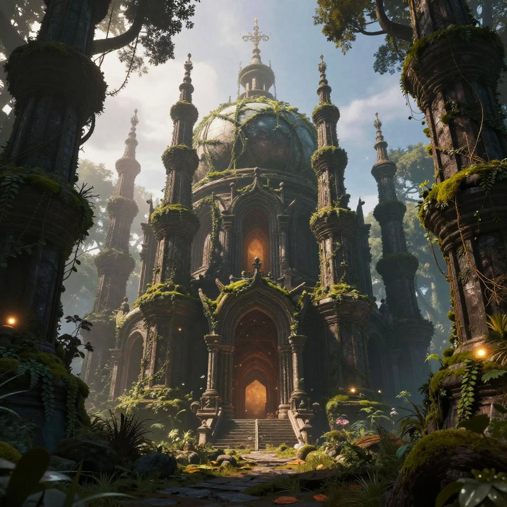Tartarian architecture, enormous ruined temples with massive domes and spiral towers, covered in vines and moss, set in an enchanted forest at dawn, mystical glowing lights illuminating the scene, ultra-detailed fantasy realism, dramatic shadows and depth