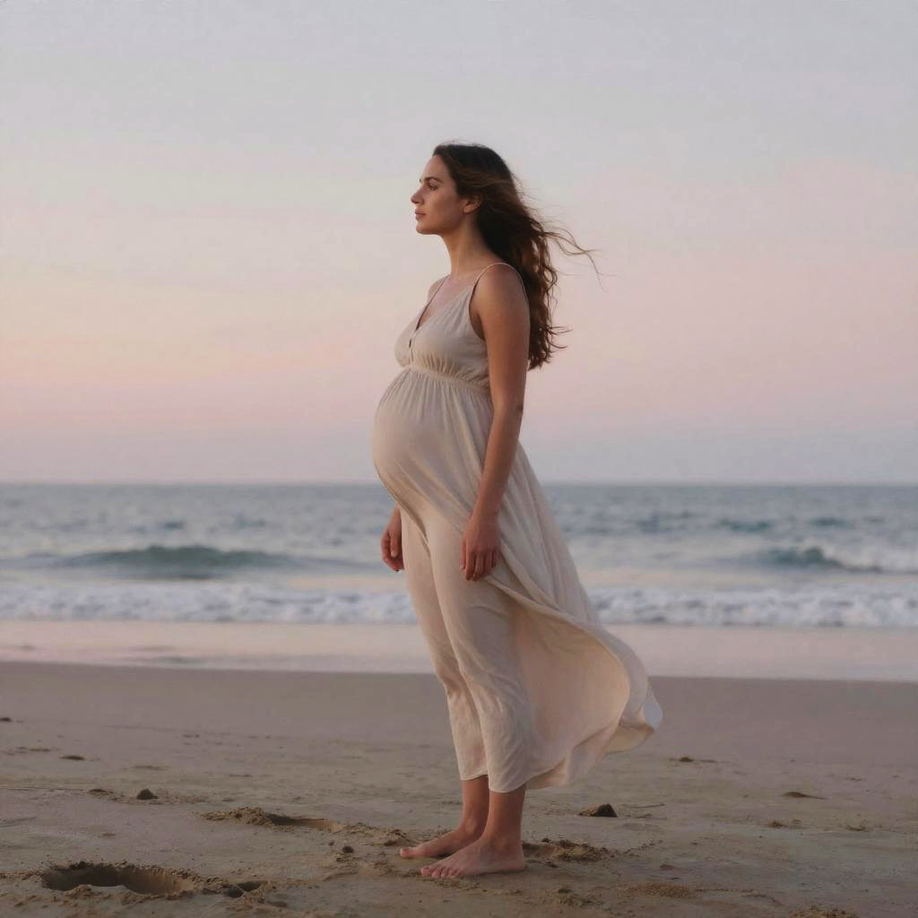 Ana de Armas pregnant, serene beach at sunset, barefoot on the sand, soft pastel colors, gentle breeze in her hair, tranquil and emotive mood painting