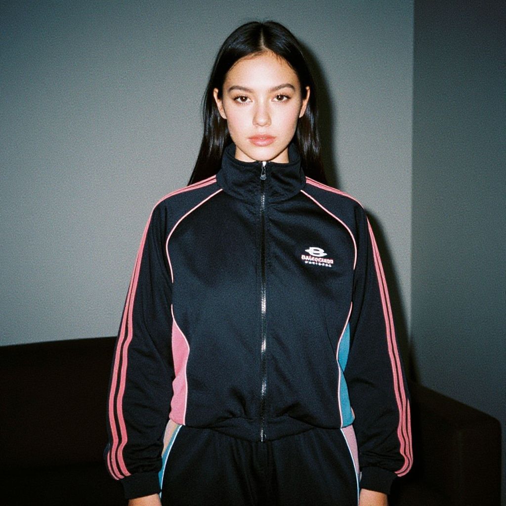 Realistic! photoshoot for a new balenciaga lookbook, color film photography, portrait of a beautiful woman wearing a track suit, photo in style of tyler mitchell, y2k!!!, 35mm lens