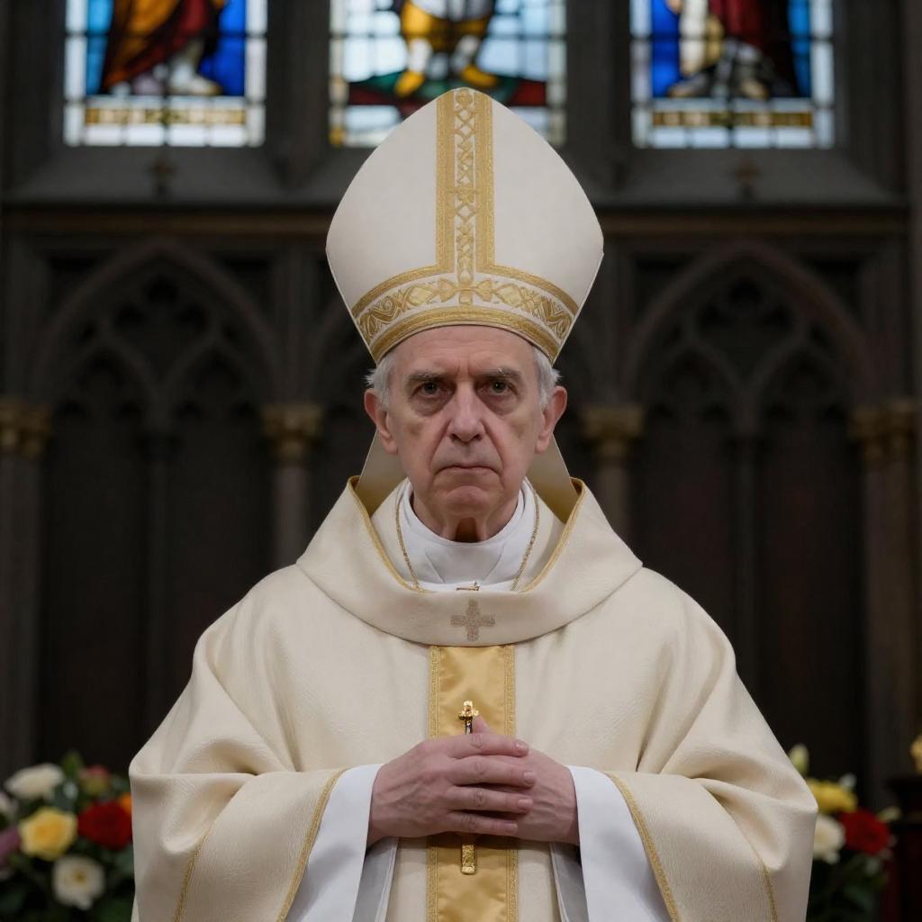 Photograph of an elderly man with pale skin, gray hair, and a stern expression. He wears an ornate white and gold bishop's mitre and robe with intricate patterns. He stands in front of a dark, ornately decorated background with stained glass windows above. Flowers are visible at the bottom.