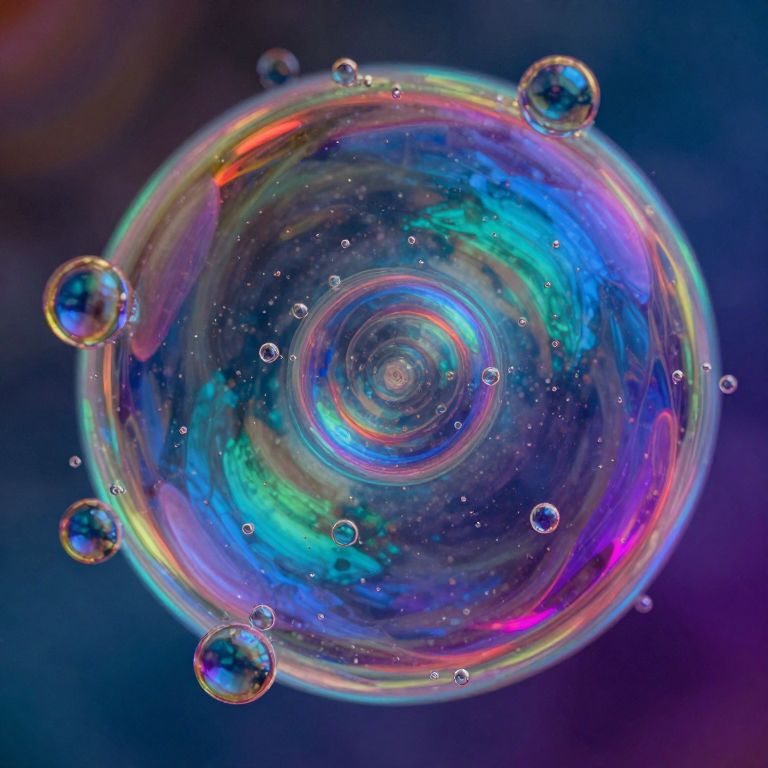 Colorful, iridescent bubbles and droplets in a fluid, abstract composition, resembling a microscopic, holographic universe.