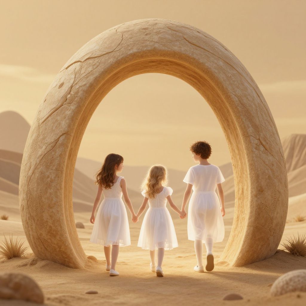 Photograph of three children holding hands, walking through a large, circular stone archway in a desert at sunset. The children, two girls and one boy, wear white dresses and a white shirt, respectively, with the girls' dresses having short sleeves and the boy's shirt being plain. The desert landscape features sand dunes and sparse vegetation, with the golden sunlight casting warm, soft shadows. The stone arch has a textured, weathered appearance. The scene evokes a sense of adventure and innocence, with the children's backs facing the camera, creating a sense of movement and exploration.